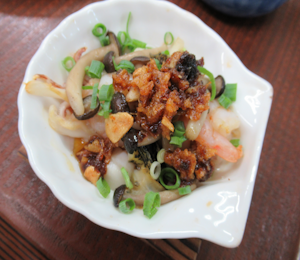 - 新鮮な海鮮物に、にんにくラー油を和えた逸品です。