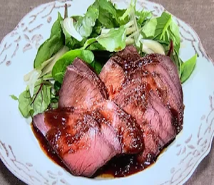 - 鹿肉のロース肉を表面に焼き色をつけた後、オーブンや湯煎でゆっくりと火を通す調理法です。パサつきやすい鹿肉を柔らかく仕上げるため、調理には肉の常温に戻す、休ませるなどの工程が重要です。フッ素コーティングされた肉をオーブンで焼いて粗熱を取る際、または湯煎で火を通してから、スライスしてソースを添えて提供します。